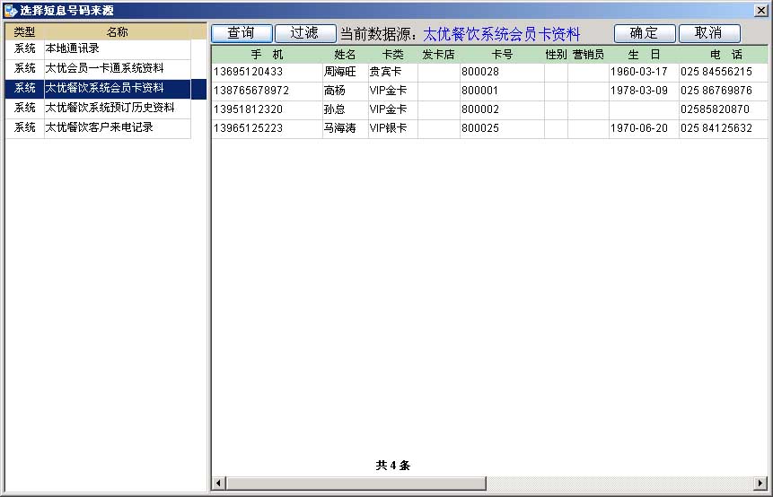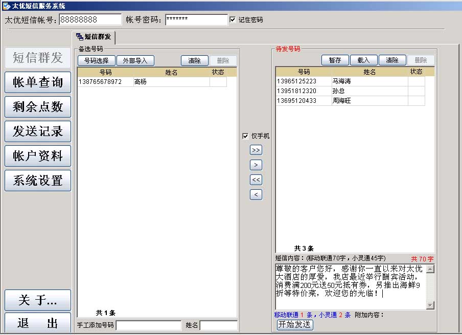 3。发送客户群 普通短信群发软件发送对像大多通过号码段选择,或是通过购买所谓老板手机号码库等于方式寻找手机号码,这样存在太多空号等无效号码,即浪费钱又达不到发送效果。太优短信服务系统发送对像是直接目标客户,如酒店系统中打电话预订的手机号码,餐饮系统中预订的手机号码,会员卡资料中客户手机号码等等。